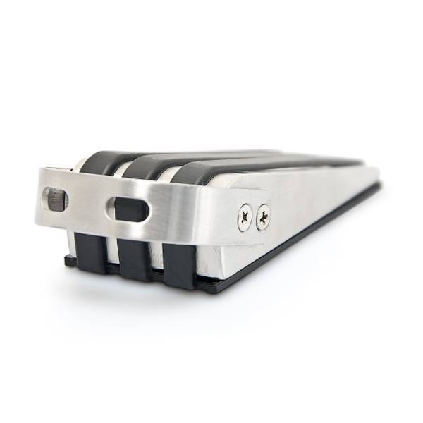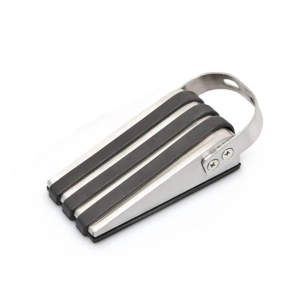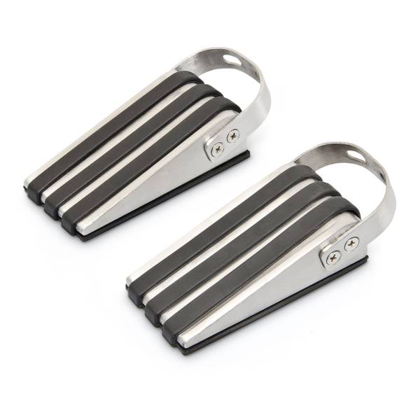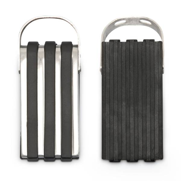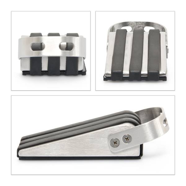 Die Türkeile sind aus gebürstetem Edelstahl hergestellt und mit einer schwarzen Gummischicht überzogen. Diese ist auf der Unterseite geriffelt und bietet zusätzliche Rutschfestigkeit. Auf der Oberseite bildet die Gummierung drei schmale Streifen, die sich elegant an das glänzende Metall schmiegen. Am Henkel können Sie die Türkeile greifen, unter der Tür platzieren, hervorziehen oder umpositionieren.