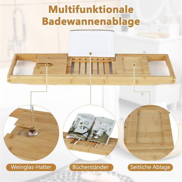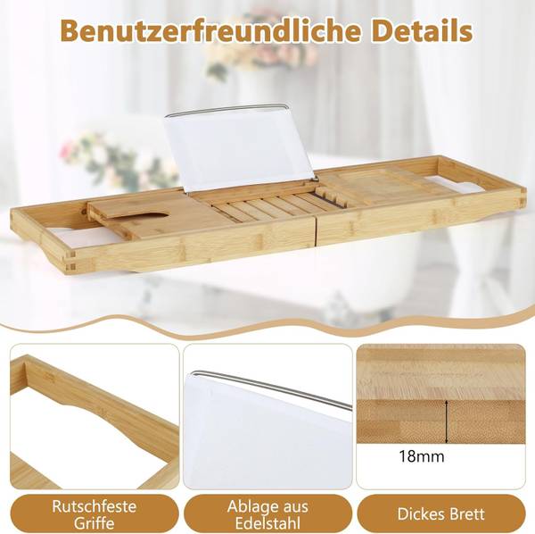 Genießen Sie Ihre Lieblingsaktivitäten beim Baden und schaffen Sie mit unserem Badetablett ein personalisiertes und komfortables Erlebnis. Hergestellt aus natürlichem Bambus ist unser Badewannenregal eine langlebige und elegante Ergänzung für Ihr Badezimmer. Darüber hinaus ist dieses Badewannenregal perfekt für verschiedene Arten von Badewannen mit ausziehbaren Griffen, rutschfestem Design. Darüber hinaus umfasst das multifunktionale Design einen Weinglashalter, einen Buchständer und ein elektronisches Fach für ein bequemes Badeerlebnis.