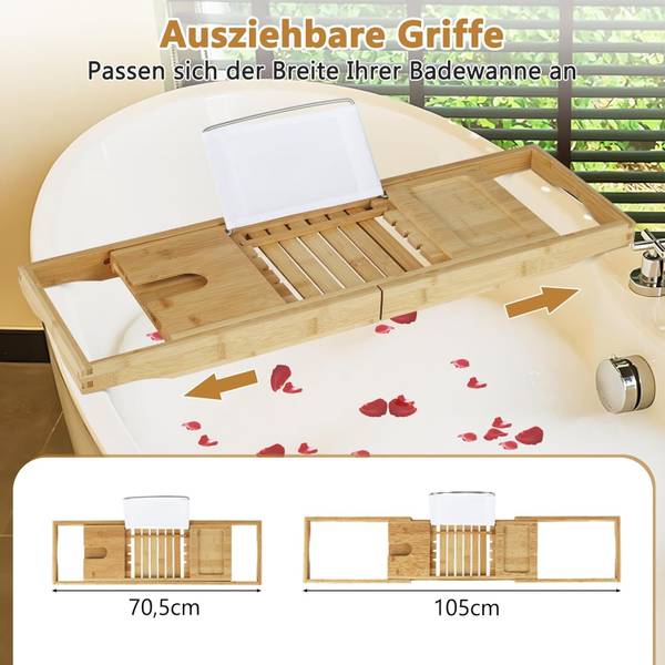 Ausgestattet mit ausziehbaren Griffen kann unser Badewannenregal von 70,5 cm auf 105 cm erweitert werden, indem Sie einfach an einem Ende ziehen, um sicherzustellen, dass es perfekt auf die Breite Ihrer Badewanne passt. Darüber hinaus halten die rutschfesten Griffe das Badetablett während Ihrer Entspannung an Ort und Stelle.