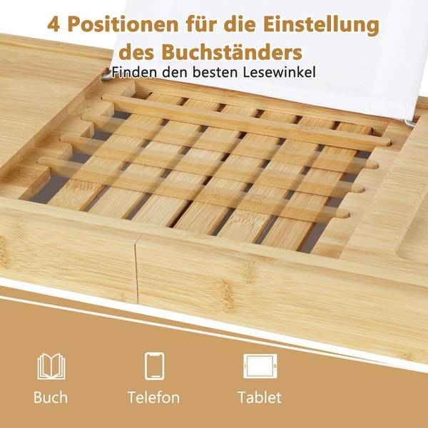 Unser Badewannenregal verfügt über eine 4-Positionen-Buchständerverstellung, mit der Sie den besten Lesewinkel für Ihr Buch, Ihr Telefon oder Tablet in verschiedenen Badehaltungen finden können. Gleichzeitig schützt der Stoffüberlauf Ihr Buch vor Tropfen und Spritzern.