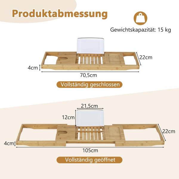 Verwöhnen Sie Ihre Lieben mit einer entspannenden Badezeit und lassen Sie sie ihre Lieblingsbücher und Fernsehsendungen während des Badens genießen. Darüber hinaus ist dieses Bambus-Badetablett einfach zu verwenden, ohne dass eine Montage erforderlich ist.
