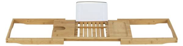 Das praktische Badewannenregal hält alle Ihre Badeutensilien griffbereit, damit Sie ein angenehmes Badeerlebnis genießen können. Mit einem Weinglashalter für Ihren Wein, einem Buchständer für Ihr Buch und Tablet sowie einem tiefen Seitenfach für Aromatherapie, Seife, ätherische Öle und andere Toilettenartikel.