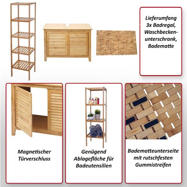 - Lieferumfang: 3x Badregal, Waschbeckenunterschrank, Badematte