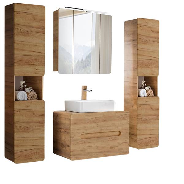 - Lieferumfang: 1 Aufbauleuchte, 1 Spiegelschrank, 1 Waschbecken, 2 Hochschränke