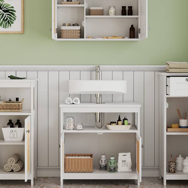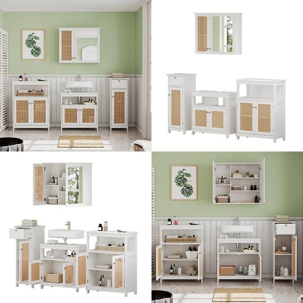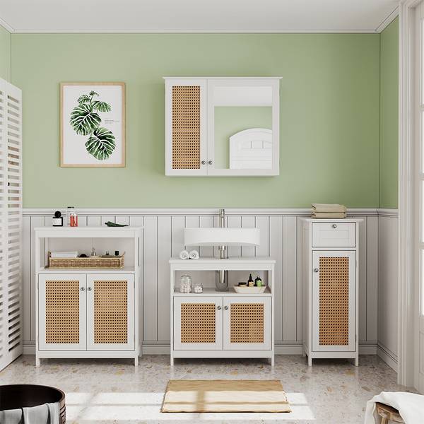 Entdecken Sie das exquisite Badmöbel-Set: Das Türdekor mit Rattangeflecht im Lochmuster verleiht Ihrem Badezimmer eine einzigartige Eleganz. Genießen Sie großzügigen Stauraum für eine aufgeräumte Umgebung - die praktische Lösung für Ihre Badezimmerutensilien. Erleichtern Sie sich das Leben mit der unkomplizierten Montage, um rasch Ihre stilvollen neuen Möbel zu nutzen. Die pflegeleichte Oberfläche bewahrt anhaltende Schönheit und ermöglicht Ihnen eine mühelose Reinigung, um die Eleganz Ihrer Möbel zu erhalten.