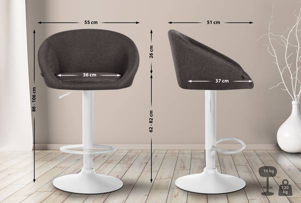 Dieser Barhocker zeichnet sich durch sein zeitlos Design aus. Die hochwertig gepolsterte Sitzschale erhält durch die stabilen Seitenlehnen zusätzlichen Komfort und macht diesen Barstuhl fast schon zu einem kleinen Sessel. Der Stoffbezug aus 100% Polyester ist einfach zu reinigen. Das Gestell besteht wahlweise aus schwarzem oder weißem Metall und bietet somit höchste Stabilität. Die praktische Fußstütze lässt Ihre Füße nicht hängen. Der Barhocker ist mittels eines Gaslifts stufenlos höhenverstellbar und die Sitzfläche ist um 360° drehbar.