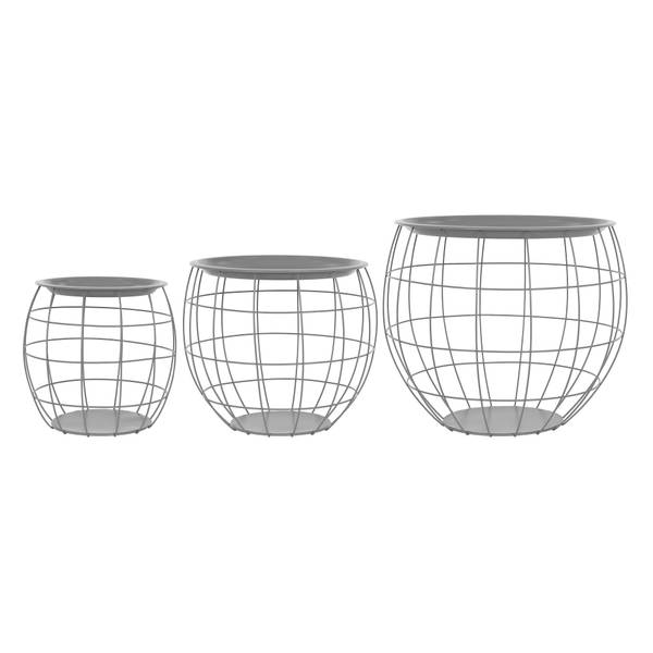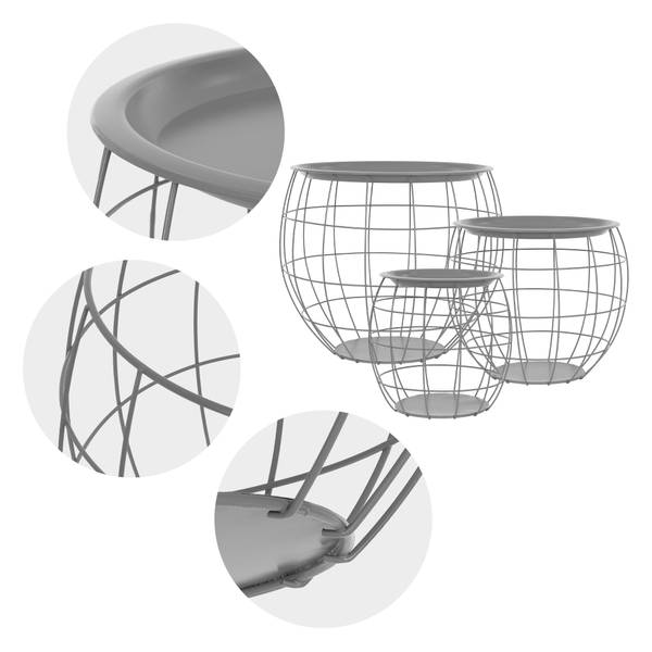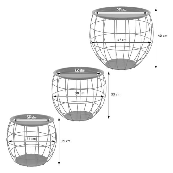 Das 3er Set besteht aus 3 unterschiedlich großen Beistelltischen, die unzählige Möglichkeiten bieten. Ein Tisch besteht aus 2 Teilen, aus einer Tischplatte und einem Metallkorb.