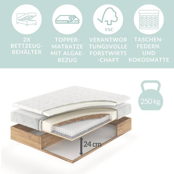 - Lieferumfang: Box 1,2 inkl. Bettkasten, Topper & Montageanleitung; Box 3 - Kopfteil