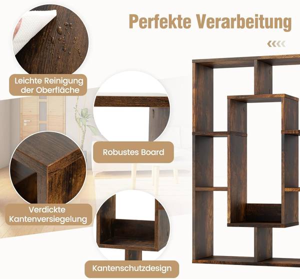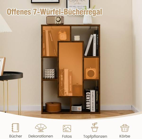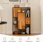 Mit 7 Fächern unterschiedlicher Größe bietet das Bücherregal vielseitige Aufbewahrungs- und Präsentationsmöglichkeiten für Bücher, Ornamente, Topfpflanzen, Fotos und Körbe. Zudem nutzen die vertikale Struktur und das offene Design den Raum effizient und maximieren sein Lagerpotenzial.