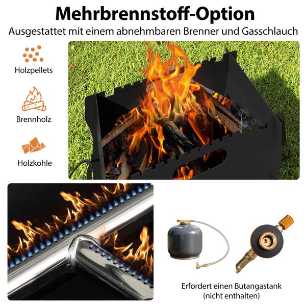 - 【Mehrstoffoption】Dieser Grill verfügt über einen abnehmbaren Gasschlauch und einen Brenner für die Nutzung von Butan (Butantank nicht enthalten). Sie können sie auch entfernen und Holzkohle, Holz oder Brennpellets für ein traditionelleres Kocherlebnis verwenden.