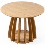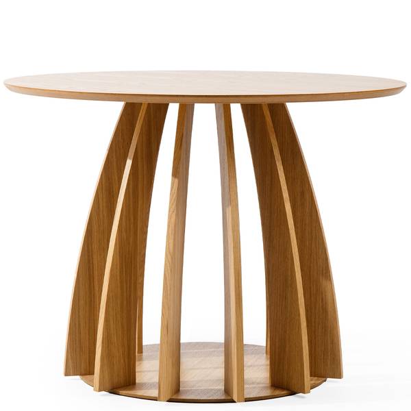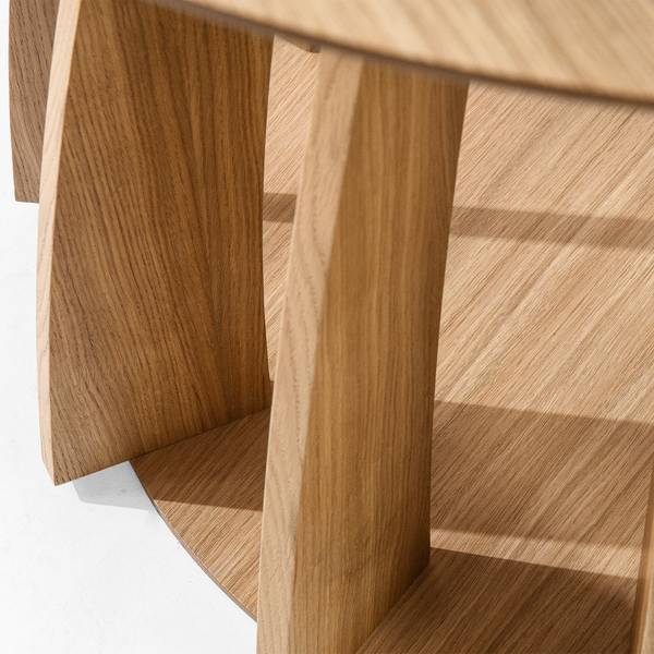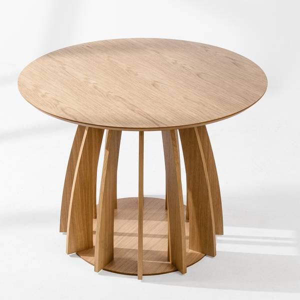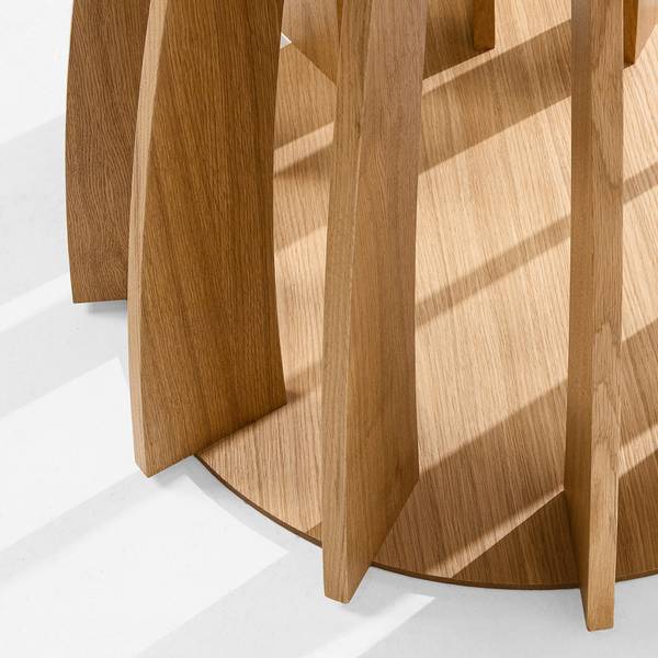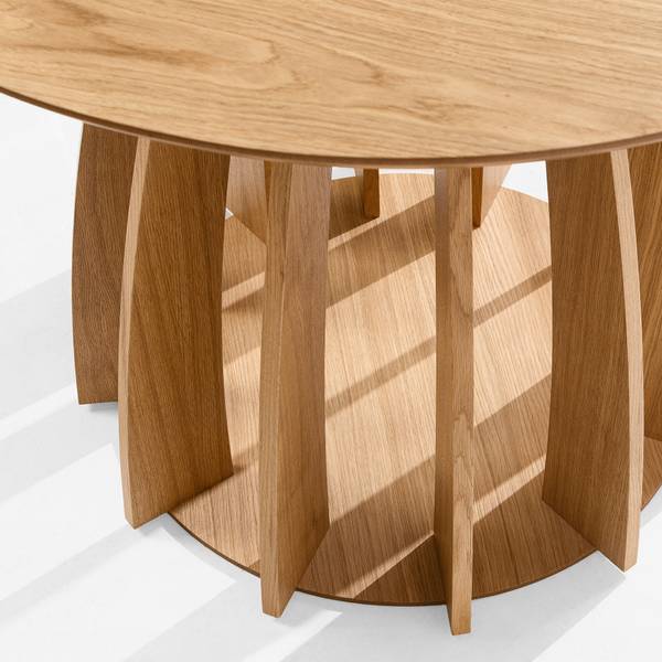 Was APOLI zu einem echten Designerstück macht, ist sein einzigartiger Sockel – eine sorgfältig gestaltete Konstruktion aus mehreren gebogenen, gewölbten Elementen, die nahtlos in eine solide, stabile Basis übergehen. Die Verkleidung aus natürlichem Eichenfurnier unterstreicht nicht nur den edlen Charakter des Tisches, sondern fällt auch durch seine originelle Form auf. Dank dieser architektonischen Struktur wirkt APOLI äußerst leicht und modern, obwohl er aus langlebigen, hochwertigen Materialien gefertigt ist.