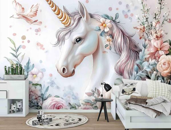 Fototapete Kinderzimmer Einhorn Blumen | inklusive Kleister