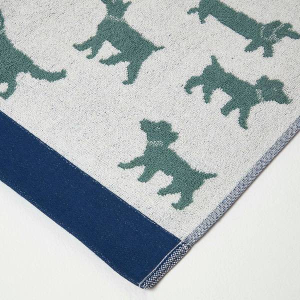 Das Frottee-Handtuch aus hochwertiger türkischer Baumwolle mit einem Stoffgewicht von 500 g/m² besticht mit einem verspielten Hundemuster und einer breiten blauen Bordüre. Das sorgfältig in Jacquard-Webung gefertigte Handtuch ist in Grün und Blau erhältlich und wird als 50 x 85 cm großes Handtuch, 70 x 125 cm großes Duschtuch und 90 x 145 cm großes Badelaken angeboten. Die flauschigen und saugfähigen Handtücher sind ideal für Tierliebhaber und Hundefreunde und auch eine tolle Geschenk-Idee.