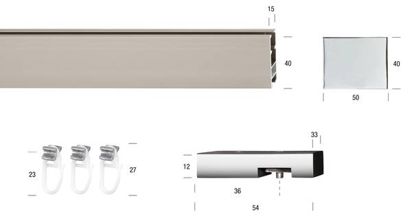 - Lieferumfang: 1 Innenlaufprofil, 36 Gleiter, 3 Deckenträger inkl. Montagematerial, 2 Endknöpfe ohne Rillen, 1 Profilverbinder, Montageanleitung