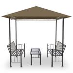 Das Set besteht aus einem Pavillon mit einem stabilen Stahlrahmen und aus einem UV- und wasserbeständigen Sonnendach mit verstärkten Ecken. So genießen Sie und Ihre Gäste kühlen Schatten und ein trockenes Plätzchen bei Regen oder starker Sonne. Auch der praktische Tisch und die Bänke sind aus Stahl gefertigt und sind dadurch sehr langlebig und robust. Die leicht schrägen Rückenlehnen der Bänke sorgen für optimalen Sitzkomfort. Die geschwungene Verzierung an der Traufe verleiht dem Gartenpavillon einen eleganten Look.