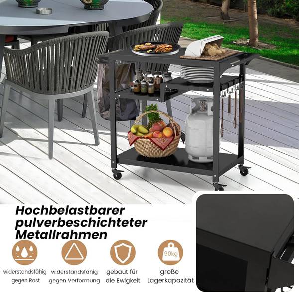 Unser Grillwagen für den Innen- und Außenbereich kann als BBQ-Grilltisch, Tisch für die Zubereitung von Speisen, Arbeitstisch zum Blumentopfen oder beweglicher Küchenwagen verwendet werden und erfüllt alle Ihre Grill-, Koch- und Aufbewahrungsbedürfnisse. Darüber hinaus verfügt der Grilltisch über eine große Tischplatte, 3 geräumige untere Ablagen, einen praktischen Handtuchhalter, einen Müllsackhalter und mehrere Haken, sodass Sie Ihr gesamtes Grillzubehör in Ordnung halten und aufhängen können. Übrigens ist er mit 4 feststellbaren Universalrädern und einem Seitengriff ausgestattet, sodass Sie ihn problemlos auf Ihrer Terrasse, im Garten oder in der Küche bewegen können. Der Pizzaofentisch besteht aus einem hochfesten, pulverbeschichteten Metallrahmen und hält einer Belastung von bis zu 90 kg stand. Erleben Sie den Komfort und die Funktionalität unseres Outdoor-Grillwagens.
