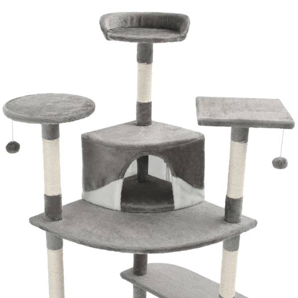 An den mit Sisalseilen umwickelten Kratzsäulen können Ihre Katzen die Krallen nach Lust und Laune schärfen und so Ihre Instinkte ausleben, was zu einem gesunden Lebensumfeld beiträgt. Ebenfalls werden es die Katzen genießen, einander hinterherzujagen, während sie diesen spaßigen Spielplatz hoch- und runterspringen. Ganz oben auf dem Katzenbaum sind 2 Spielzeuge befestigt, die neugierigen Katze viel Spielspaß bereiten werden. Nachdem sie genug gespielt haben, werden Ihre kleinen vierbeinigen Freunde es lieben, sich auf den oberen Plattformen auszuruhen, wo sie eine bessere Aussicht haben. Darüber hinaus können sie sich auch in den gemütlichen Häusern verstecken, um ein erholsames Nickerchen zu machen oder sich ein wenig in den bequemen Körbchen entspannen.