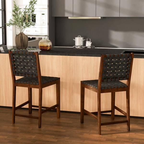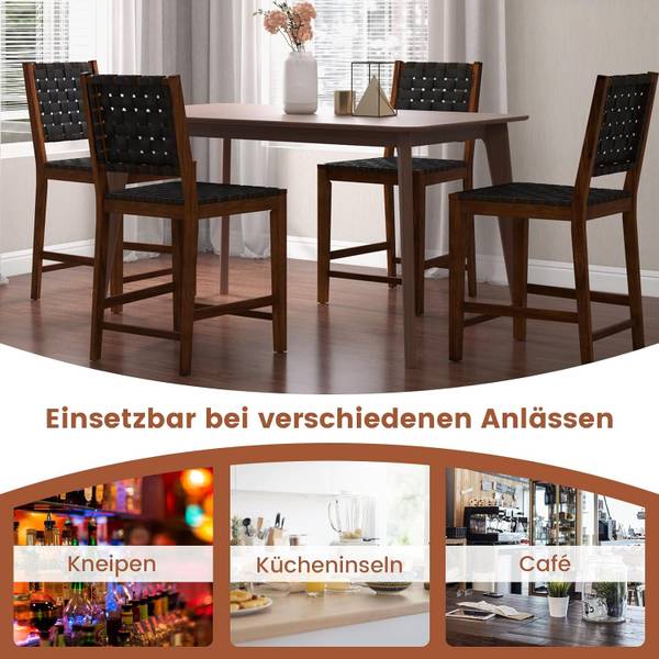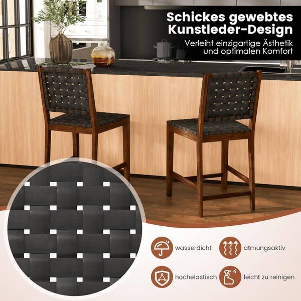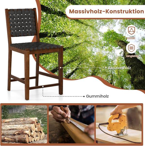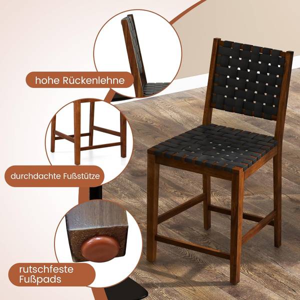 Die geschwungene Rückenlehne mit 100°Neigung passt sich perfekt Ihrer Körperkurve an und sorgt für optimalen Halt. Sitz und Rückenlehne sind mit gut gewebten Kunstlederbändern bezogen, die nicht nur für ein stilvolles Aussehen sorgen, sondern auch starken Halt bieten. Praktischerweise sorgt der Hauptrahmen aus ausgewähltem Akazienholz und Gummibaumholz für hohe Stabilität und Langlebigkeit. Diese Barstühle eignen sich perfekt für verschiedene Innenbereiche wie Küchen, Esszimmer und Restaurants und werden Ihren unterschiedlichen Anforderungen gerecht.