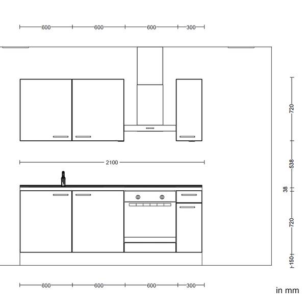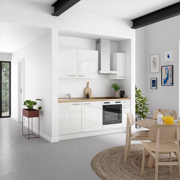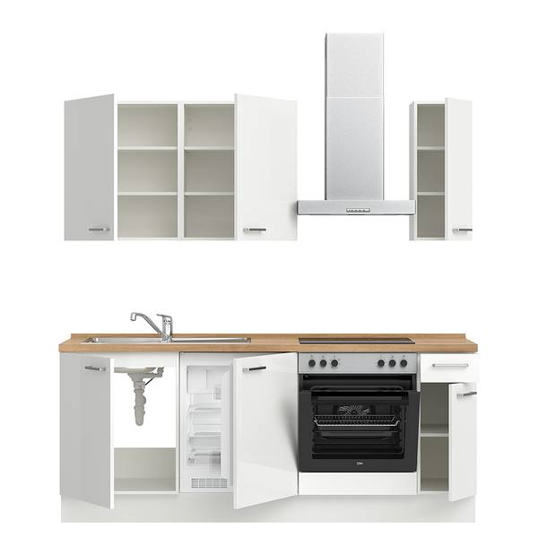 - Lieferumfang: Küchenzeile bestehend aus 1 Spülenunterschrank, 1 Türfront für integrierte Kühlgeräte, 1 Kochstellenunterschrank, 1 Unterschrank, 3 Wandschränke