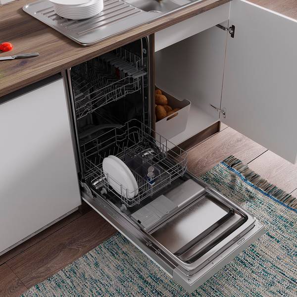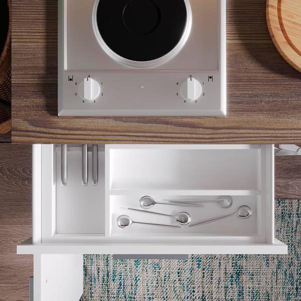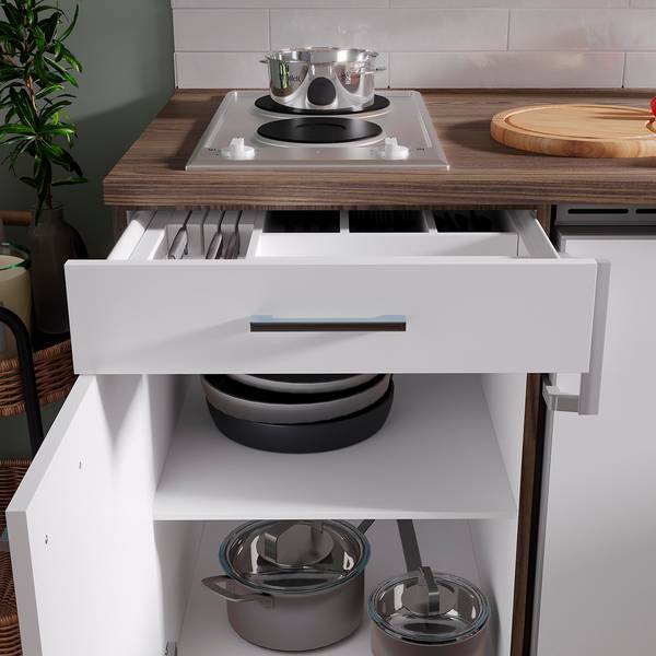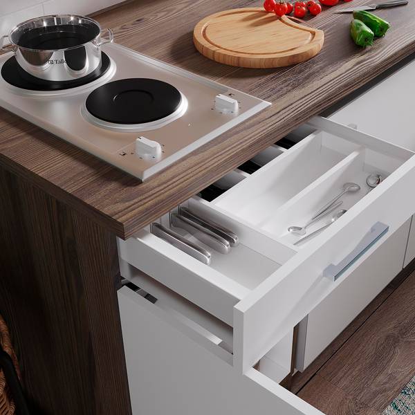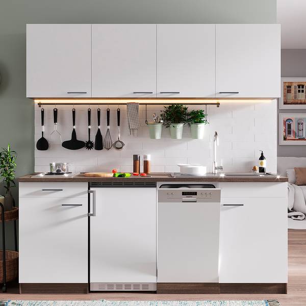 - Inklusive Elektrogeräte: 1 Unterbaukühlschrank mit Gefrierfach, 1 Kochmulde mit 2 Platten & 1 teilintegrierter Geschirrspüler