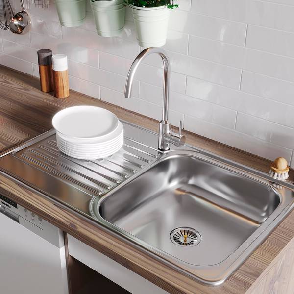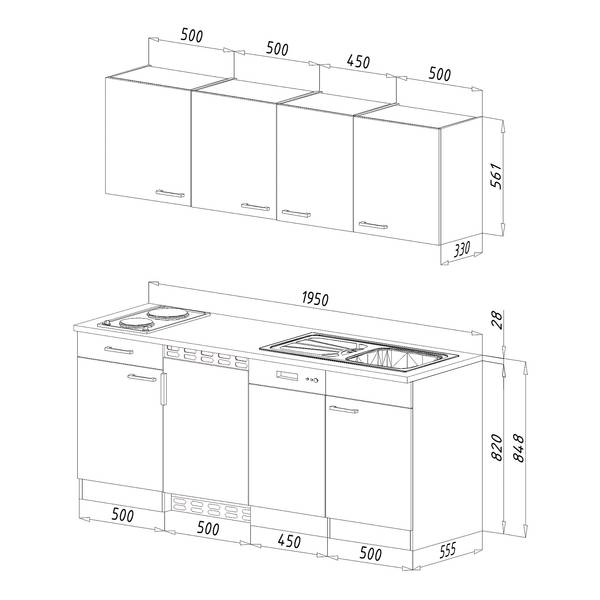 - Küchenzeile bestehend aus 1 Edelstahl-Einbauspüle mit Ab- und Überlaufgarnitur, 1 Nische mit Dekorblende für Geschirrspüler 45 cm, 1 Arbeitsplatte (28 mm) ohne Ausschnitt, 1 Unterschrank mit Schublade 50 cm, 1 Spülenunterschrank 50 cm, 3 Hängeschränke 50 cm & 1 Hängeschrank 45 cm