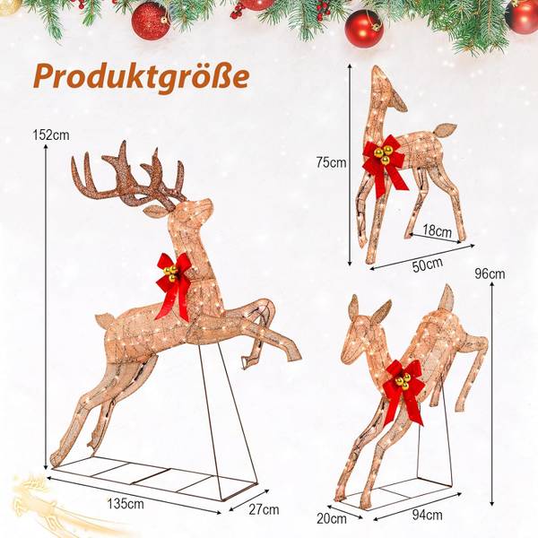 Im Vergleich zu anderen Rentiersets, die nur ein Rentier haben, enthält unser Weihnachtsrentier-Familienset ein Set mit 3 Rentieren, um das Konzept der warmen Wiedervereinigung zu vermitteln. Mit 255 warmweißen Lichtern ist das Weihnachtsrentier-Set eine außergewöhnliche Ergänzung zu Ihrer Weihnachtsdekoration und verleiht Ihrer Umgebung einen bezaubernden und magischen Touch. Außerdem werden sie mit goldenem Stoff glitzern, besonders im Licht, was eine einzigartige Atmosphäre von Weihnachten schafft. Unterstützt von einem Metallständer und gesichert mit 12 Erdspießen, haben die Rentierfamilien keinen instabilen Aufbau.