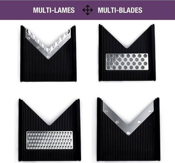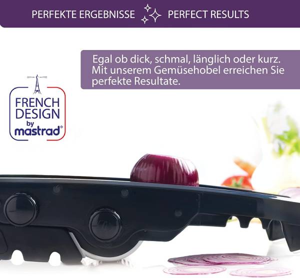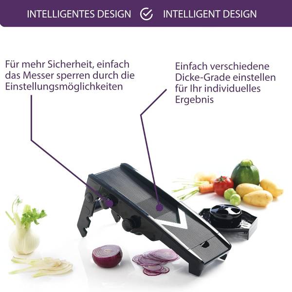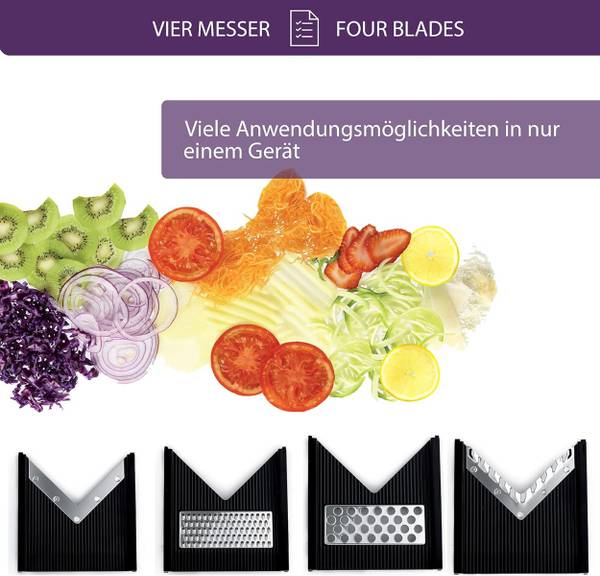 - Lieferumfang: 1x Mandoline, 1x Handschutz, 4x Klingen