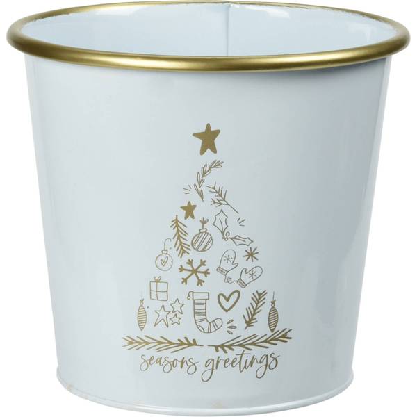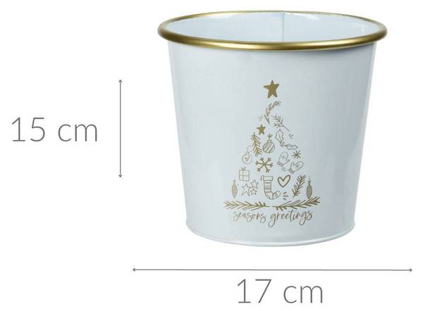 - Metalleimer für Weihnachten in Weiß: Dieser Metalleimer ist die perfekte Ergänzung für Ihre Weihnachtsdekoration. Mit seinem eleganten und zeitlosen Design passt er zu jedem Einrichtungsstil.