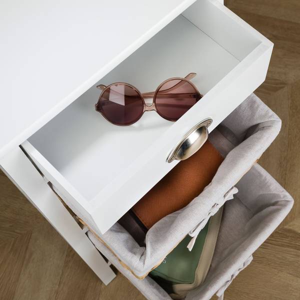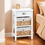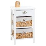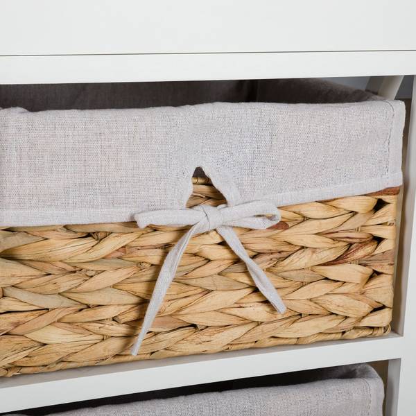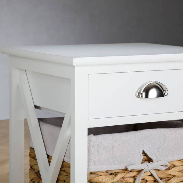 Der Nachtschrank Raveo bietet mit seinen zwei Körben aus Wasserhyazinthe und einer Schublade reichlich Stauraum für Ihre Gegenstände. Die kleine Nachtkommode im Landhausstil ist aus massiven Kiefernholz hergestellt und weiß lackiert. Der klassische Muschelgriff in Silber und die Korbbezüge mit kleinen Schleifchen unterstreichen das charmante Design. Dieser vielseitige Tisch passt perfekt ins Schlafzimmer, aber auch in den Flur oder andere Wohnbereiche.