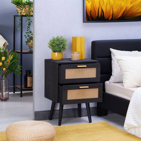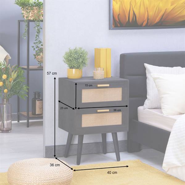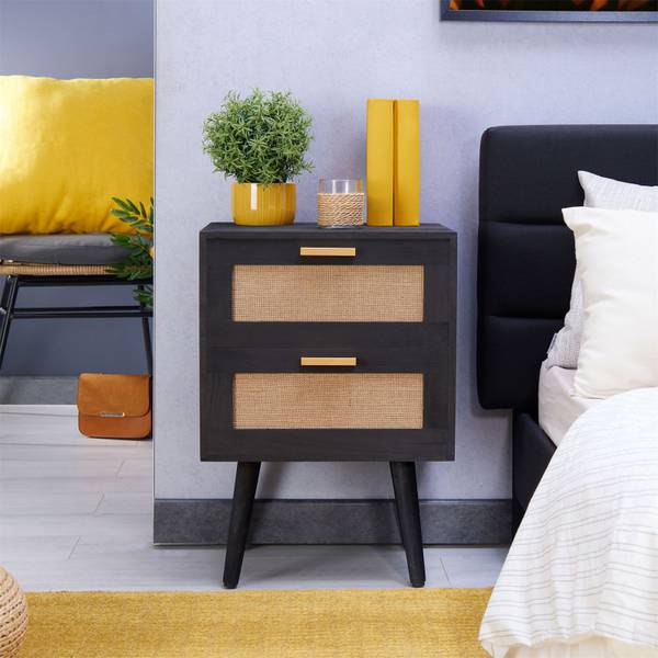 im Retro Design holen Sie sich einen wahren Hingucker in Ihr Haus. Egal ob im Schlafzimmer, im Wohnzimmer oder Esszimmer, der kleine Tisch steht überall gut. Das angesagte Design mit abstehenden Holzfüßen und Jutegeflecht verleiht Ihrer Einrichtung einen Retro oder Boho Touch. Die Griffe an den Schubladen in der Farbe Gold setzt noch einen weiteren Akzent und bietet zudem noch viel Stauraum für Accessoires, Brille, Kosmetika und alles, was Sie vor, während und nach dem Schlaf griffbereit brauchen.