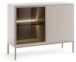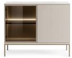Geriffelte Fronten verleihen Eleganz und lockern das schlichte Design auf. Der Korpus besteht aus 16 mm starker Schichtstoffplatte mit 0,5 mm ABS-Kante, die Fronten aus geriffeltem MDF und 4 mm starkem, schwarzem, gehärtetem Anti-Sonnenschutzglas sowie einem 18 mm starken Aluminiumrahmen – Langlebigkeit und Ästhetik in einem.