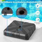 Der beschwerbare Schirmständer aus wetterbeständigem und rissfestem HDPE ist langlebig. Dank seines befüllbaren Designs, das 45 kg Wasser, 60 kg Sand oder 80 kg Wasser und Sand fasst, bietet dieser Ständer Ihrem Schirm bei unterschiedlichen Wetterbedingungen sicheren Halt. Dank des seitlichen Ablauflochs lässt sich der Ständer bei Bedarf mühelos entleeren. Der quadratische Schirmständer ist für 300 cm große Ampelschirme mit einem Schirmstockdurchmesser von 38 mm und 48 mm geeignet. Dank der Querhalterung, die perfekt zu Ihrem Ampelschirm passt, ist dieser Ständer einfach aufzustellen und zu verwenden. Durchdachte Details machen ihn zu einer zuverlässigen Wahl. Das leichte Design und die zwei tragbaren Griffe sorgen für einfachen Transport und Bewegung. Rutschfeste Rillen steigern die Stabilität zusätzlich.