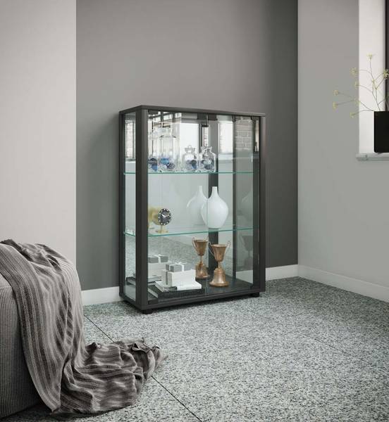 Die Spiegelrückwand verleiht der Vitrine eine moderne und außergewöhnliche Eleganz. So wird jeder Wohnraum zu etwas ganz Besonderem.