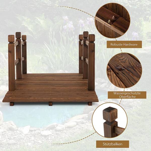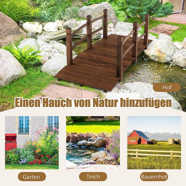 - 【Auffälliges Gartendekor】Mit der natürlichen Maserung von Tannenholz und einer dunkleren Farbe durch den Karbonisierungsprozess verleiht diese Gartenbrücke eine schlichte, aber elegante Optik. Das minimalistische Erscheinungsbild der Brücke kann Ihrem Garten, Teich oder einer anderen Gartenlandschaft einen Hauch von Natürlichkeit verleihen.