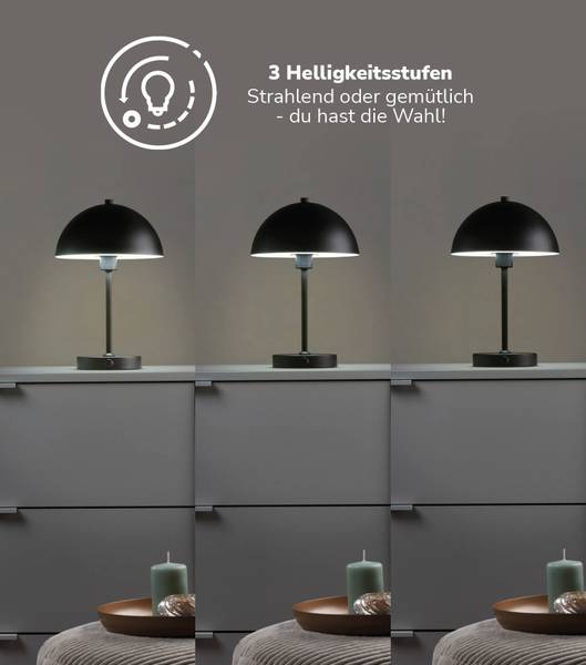 - 3 HELLIGKEITSSTUFEN! Die LED-Lampe aus Metall besitzt drei Helligkeitsstufen und spendet mildes Licht für ein stimmungsvolles Ambiente. Nutze sie als dekorative Tischleuchte oder Nachttischlampe für gemütliches Licht.