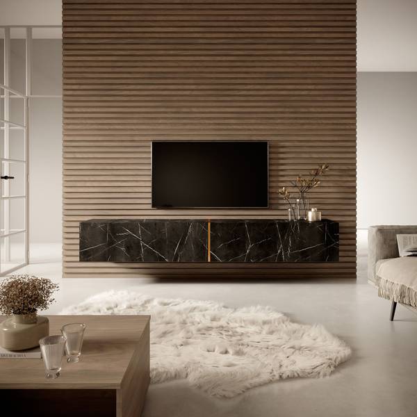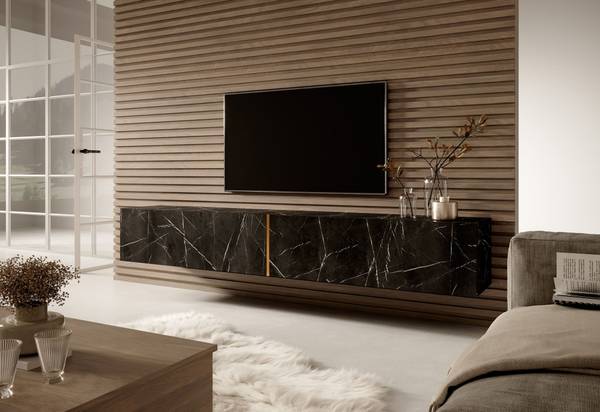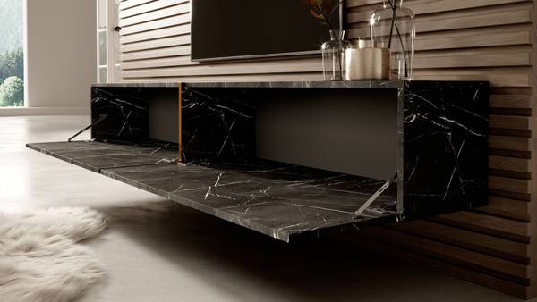 Konstruktionshinweis: Bitte beachten Sie, dass sowohl die Ober- als auch die Unterplatte des TV-Hängeboards nicht aus einem Stück gefertigt sind, sondern jeweils aus zwei einzelnen Platten bestehen. Dies beeinträchtigt weder die Stabilität noch die einwandfreie Funktion des TV-Boards.