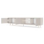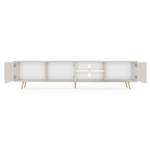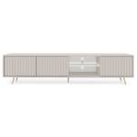 Der Bello TV-Schrank besticht durch ein schlichtes, modernes Design, das durch schmale Beine und elegante Lamellenfronten ergänzt wird. Diese Details schaffen einen edlen, zeitgemäßen Look, der sich hervorragend in minimalistische, glamouröse oder moderne Einrichtungsstile einfügt.